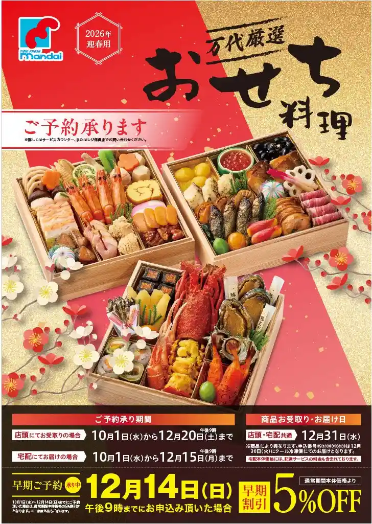 - おせち予約:10月1日から受付中、早期割引は12月14日まで